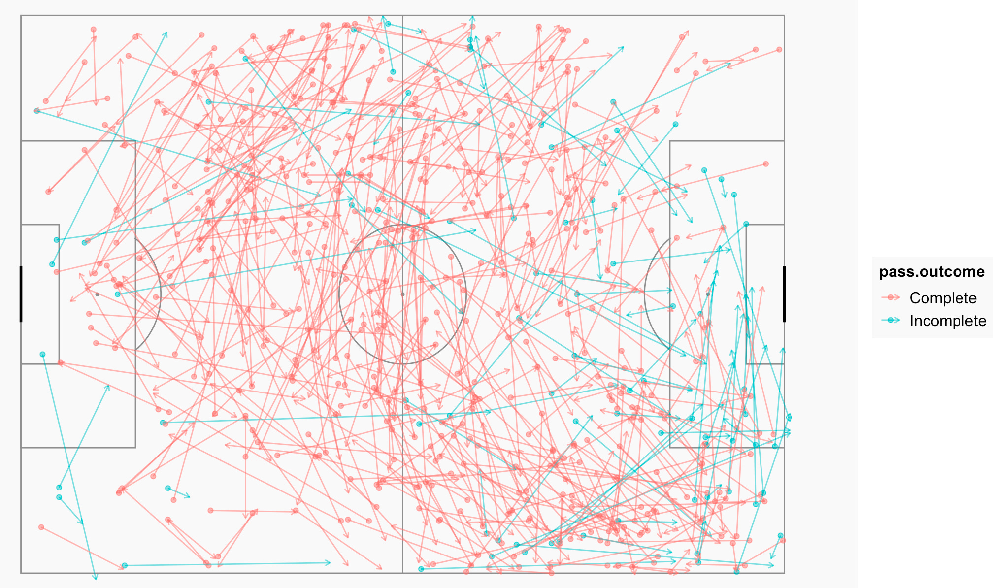 geom_segment(data = data, aes(x = location.x, y = location.y, xend = pass.end_location.x, yend = pass.end_location.y, colour = pass.outcome), alpha = 0.5, arrow = arrow(length = unit(0.06,"inches"))) +