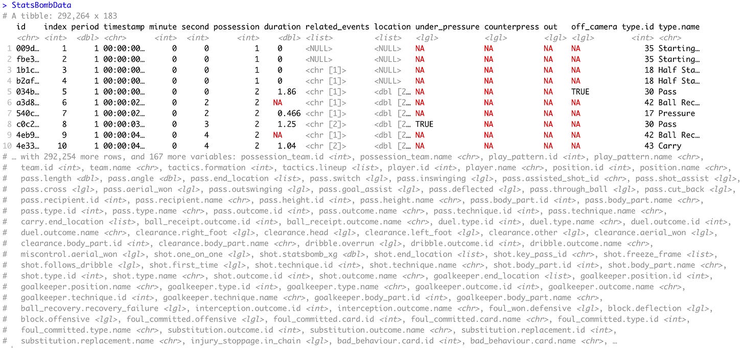 view(StatsBombData)Okkkkkkkk…292,264 rows with 183 columns. At this point have a good look at the data!